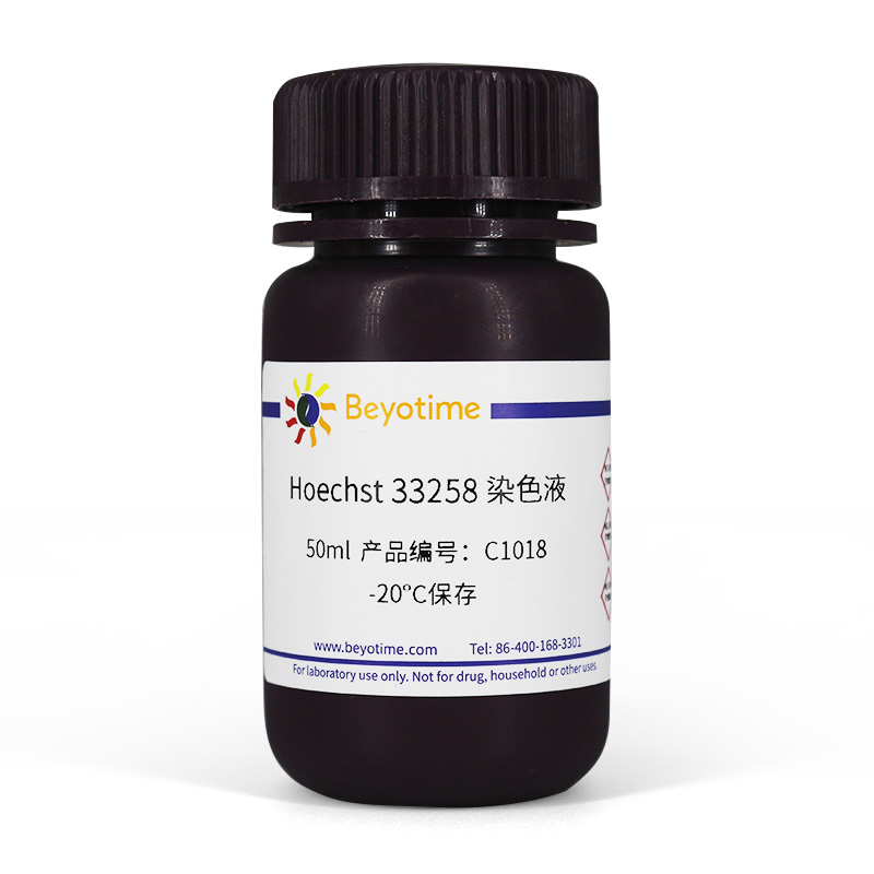 本Hoechst 33258 染色液的浓度经过碧云天的优化,确保可以满足各种常规染色的需要。如需使用特定浓度的Hoechst 33258,请选购碧云天的Hoechst 33258(C1011)。如需染色活细胞或培养的组织,请选购碧云天的Hoechst 33342活细胞染色液(100X) (C1027、C1028或C1029),效果更佳。