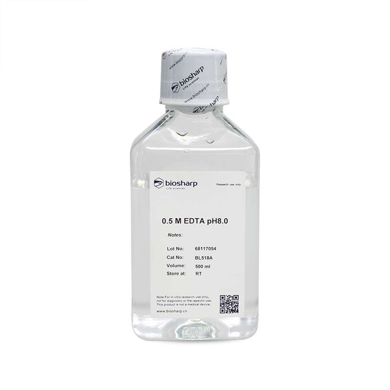 0.5M EDTA pH8.0 产品简介: 0.5M EDTA pH8.0 用 EDTA 配制,用 NaOH 调节 pH 值至 8.0。常用分子生物学 试剂,用于螯合镁离子等。 注意事项: 为了您的安全和健康,请穿实验服并戴一次性手套操作。 保存条件: 室温保存,有效期2年。