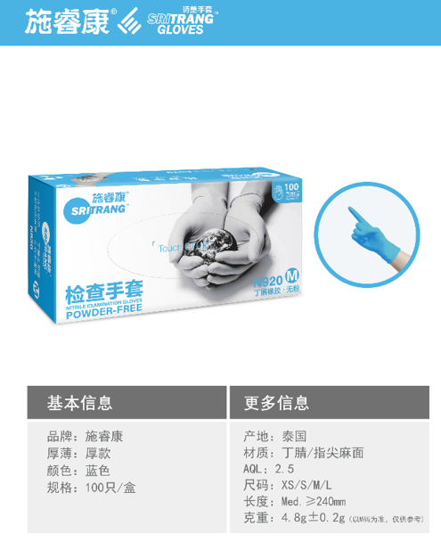 施睿康N920一次性加厚型蓝色丁腈手套M码